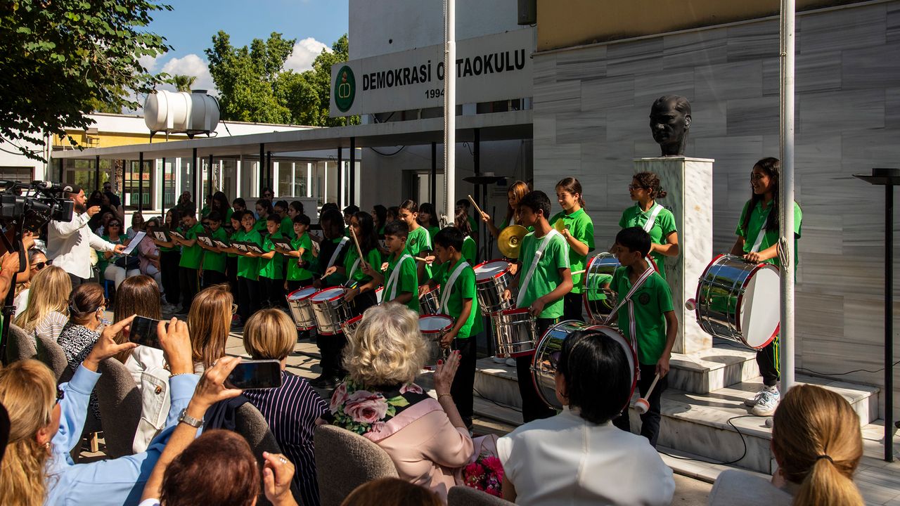 Törende ilk sözü alan Demokrasi Ortaokulu Müdürü Emine Garanti, Demokrasi Ortaokulu olarak kaliteli öğretimin her öğrencinin hakkı olduğu şiarıyla yola devam ettiklerini ve bu yolda Cumhuriyet’in yüzüncü yılını kutlarken, Havva Ramadan Cemil adına okula bando-boru-trampet takımı hediye eden Ramadan Cemil ailesine okulun bir hayalinin gerçekleşmesini sağladıkları için teşekkürlerini iletti.