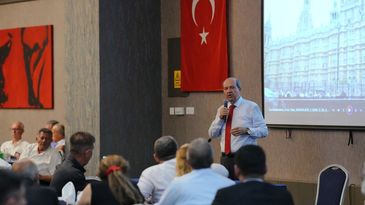 Ersin Tatar yemekte yaptığı konuşmada Türkiye Cumhuriyeti’nin tam destek verdiği iki devletli çözüm siyasetinden bahsederek, federasyon temelinde çözüm siyasetinden neden vazgeçildiğini anlattı.