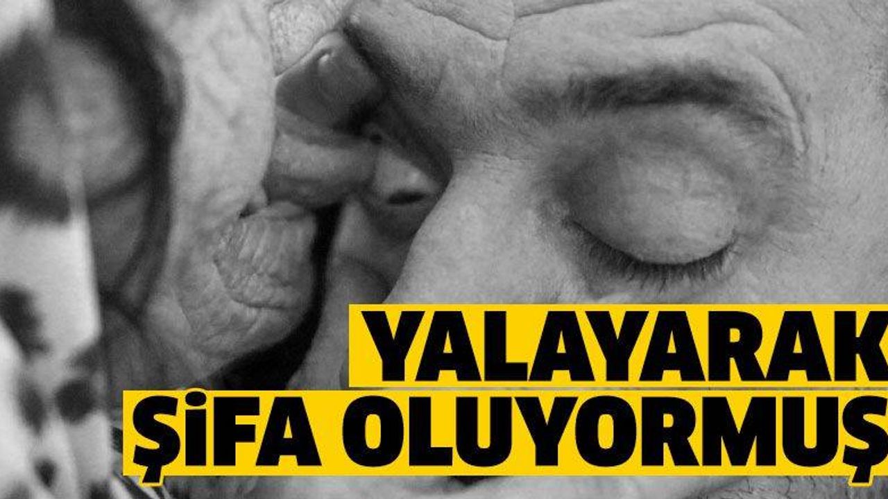 80 yaşındaki kadın ağzını alkolle temizledikten sonra insanların gözünde sıkışmış olan kurşun, demir, kömür, talaş ve cam parçalarını çıkarmak için dilini kullanıyor.